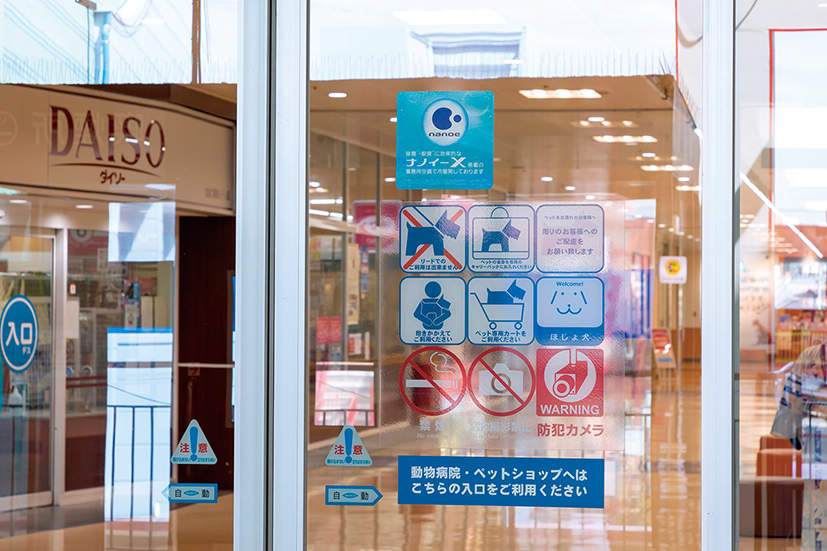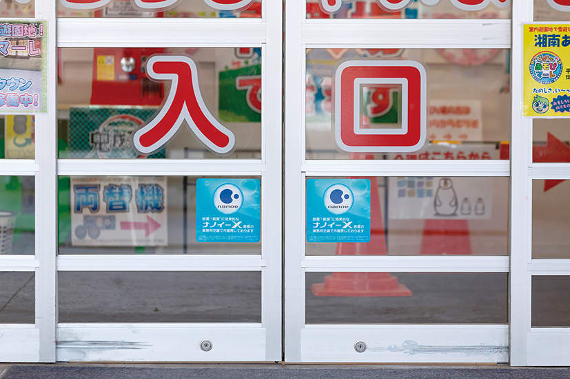 店内入口に貼り付けたステッカーでナノイーX搭載空調で空気をキレイにしている事を表示