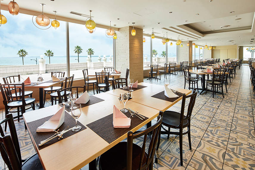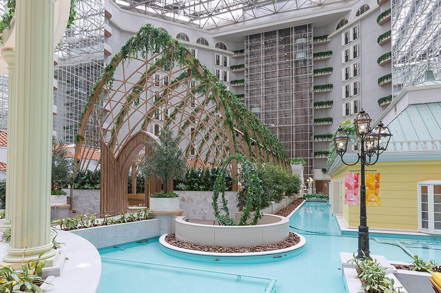 贅沢に空間を使用した造りの国内最大級のスケールを持つ開放的なアトリウムロビー。22mのバージンロードと高さ7mの木のアーチで包み込まれたチャペルや、ロビー中央には、色とりどりのプロヴァンス風タイルで花畑が表現された「ガゼボ」など、光・緑・水があふれる空間が演出されています。
