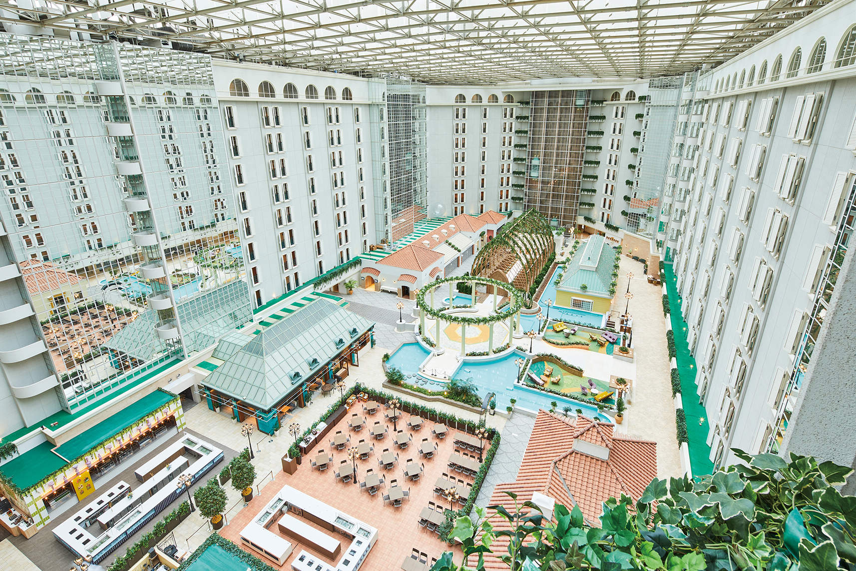 9層吹き抜けの高さ37m、広さ4,300㎡と国内最大級の大きさを誇るアトリウムは、ガラスの天井から自然光が降り注ぎ、南欧の可愛らしい街並みを温かく包み込んでいます。このアトリウムを囲むようにしてバリエーション豊富な客室が並びます。また、各部屋の180度パノラマビューのバルコニーからはパークや東京ベイの景色を眺めることができます。