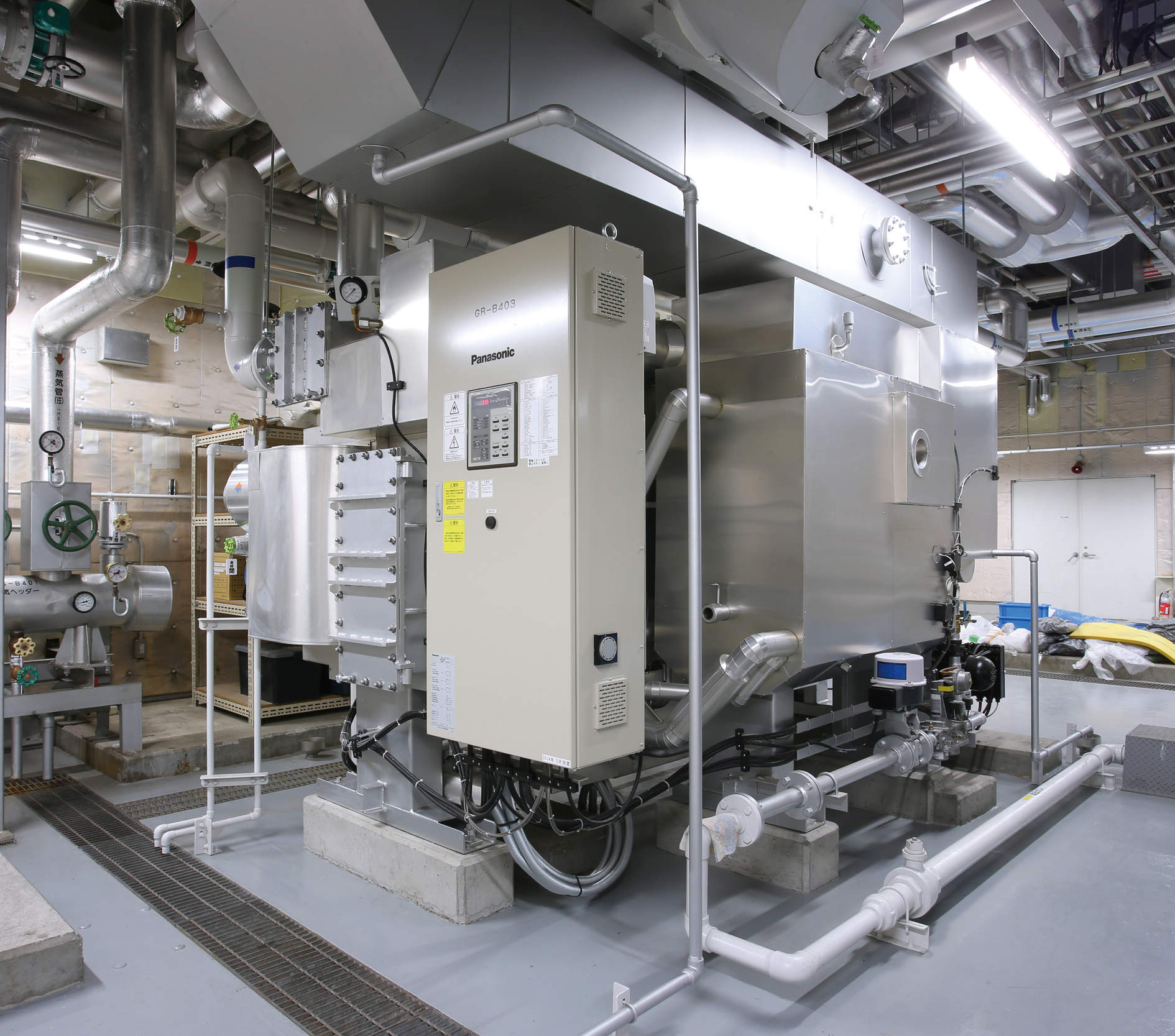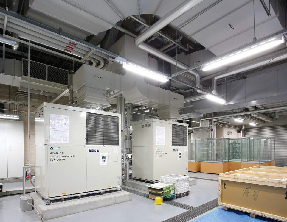 リニューアルを機に導入したジェネリンク機は、発電機からの廃熱を利用したエネルギーの有効利用により省エネ性の向上に貢献しています。また、機器のコンパクト化・低重量化によりエレベーターでの分割搬入を実現し作業の効率化も図りました。