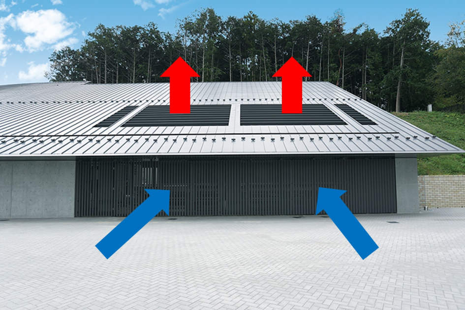 通常、熱がこもるのを避けるため室外機は風通しの良い場所に置きますが、水田三喜男記念館では外観に配慮し、室外機を屋根と壁に囲まれたスペースに配置。ファン上部にダクトを設置してエアショートを回避し、能力を最大限発揮できるように工夫。