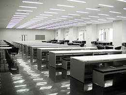 建築内部は学生の日常的な利便性等を考慮し、低層階に学生読書室等の共用機能、中層階に教室群、上層階に研究室が配置された高層積層型の校舎となっています。