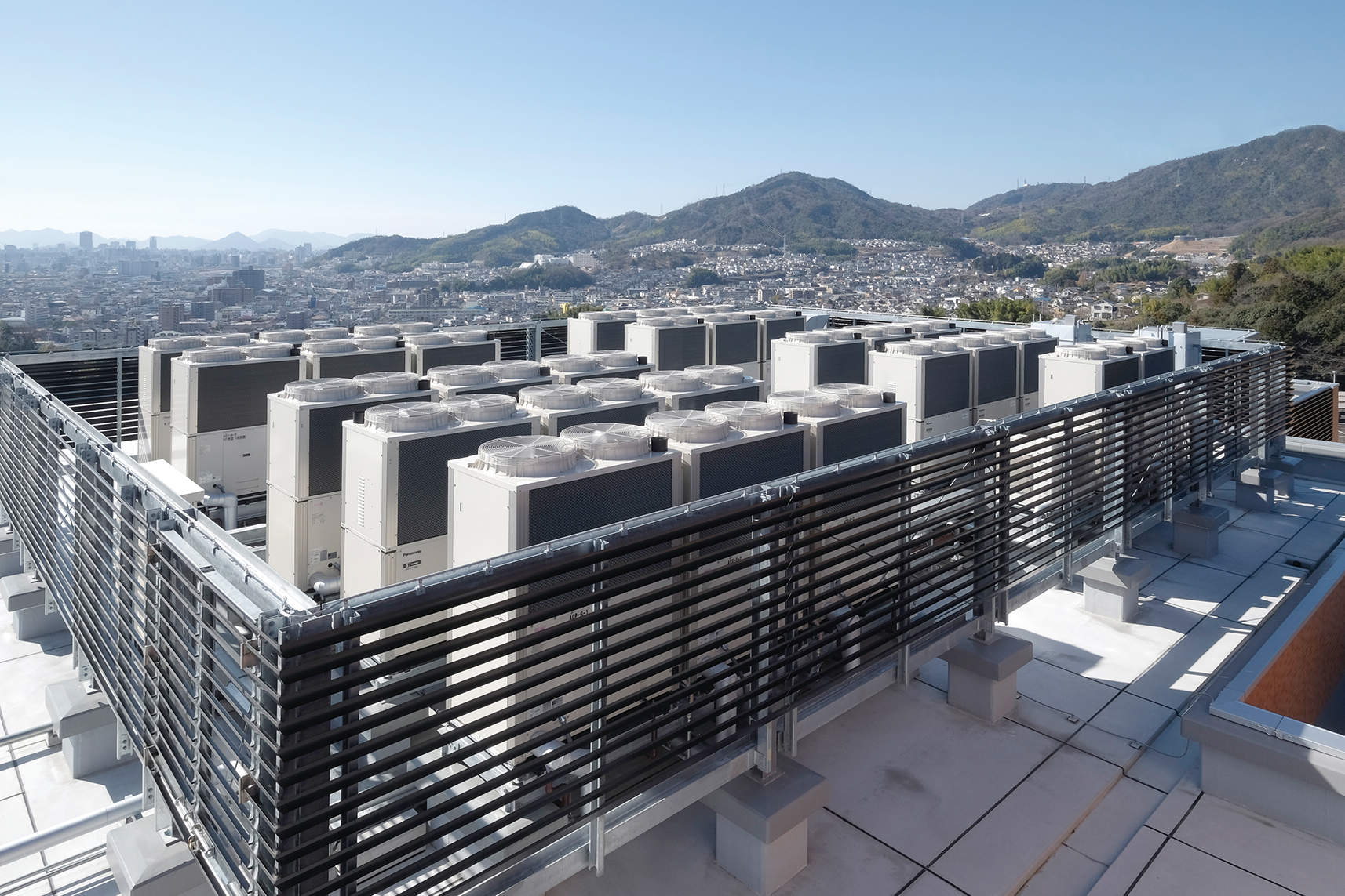 「明徳館」でのあらゆる形式のグループワークなどに対応できる可動式の設備や本格的なプレゼンテーションを可能にする円形コートのあるフロアや、小規模~中規模のディスカッションルームが並ぶフロアなど、多様な形態の空間を快適に保つための空調機器として当社GHP29台が採用されています。