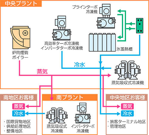 南北長4kmを超える空港島内への各施設に熱供給を行うにあたり、中央・南の各地区にプラントを設け、冷凍機を分配配置されています。