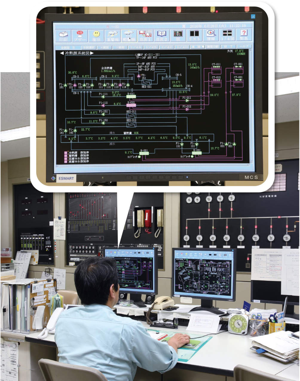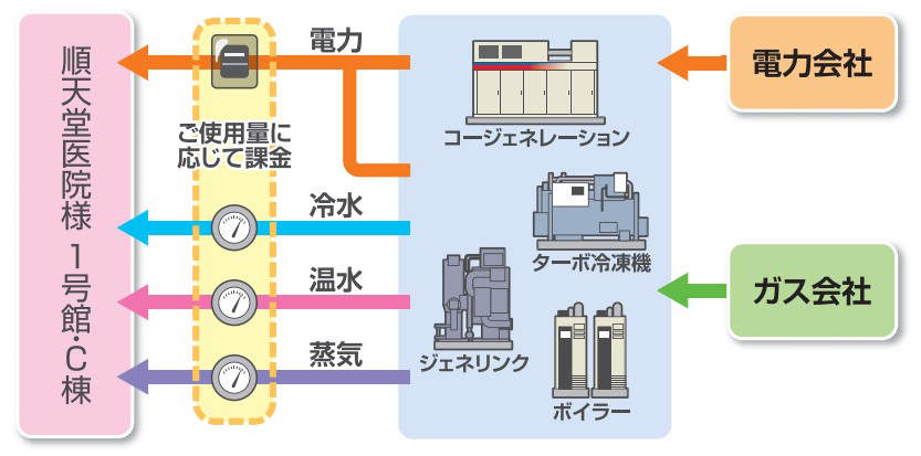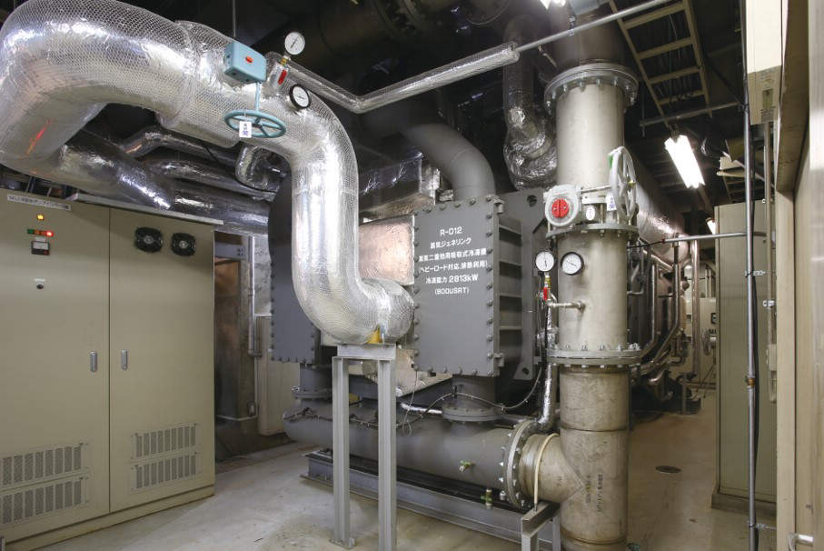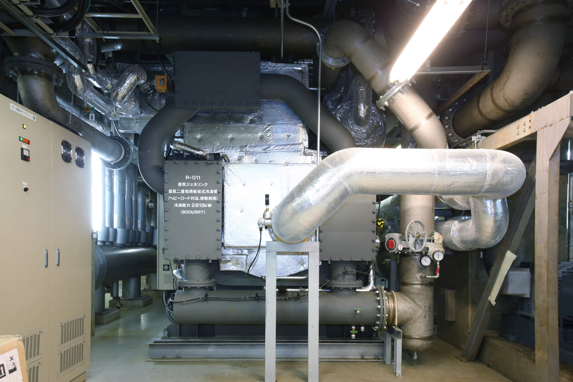 東京ガスエンジニアリングソリューションズ(株)様のエネルギーサービスの活用により、熱源機械室にコージェネ・熱源設備を設置。設備施工・フルメンテナンス・最適運用支援を行い、電気・熱・蒸気を供給しています。