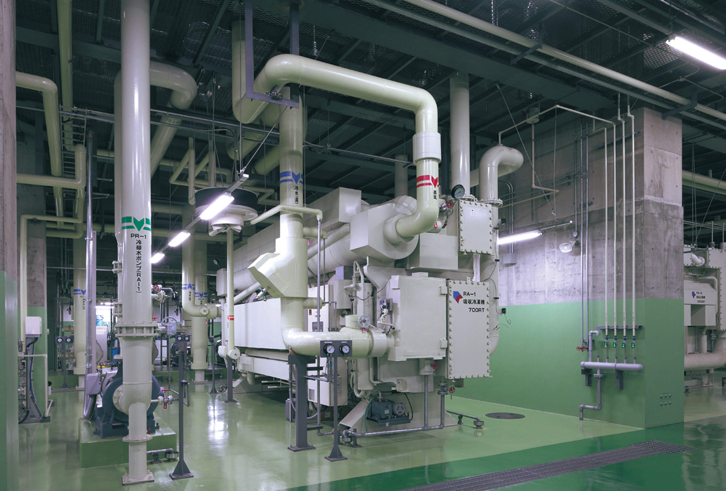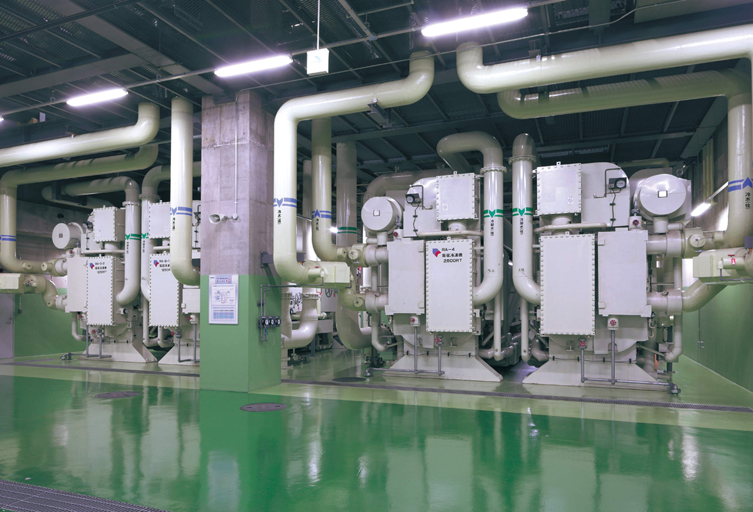 ガスタービンコージェネレーションからの廃熱蒸気とボイラーからの蒸気を熱源とし、広域な地域冷暖房システムの設備の一部として、エネルギーの有効活用と、無駄のない社会づくりに大きく貢献しています。
