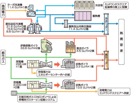都市ガス熱源の蒸気ボイラとガスタービンコージェネレーションの採用により、高いエネルギー効率と経済性向上の両立を図っています。特にガスタービンコージェネレーションは大小二種類の組み合わせにより、幅広い熱負荷の変動への対応を可能としています。