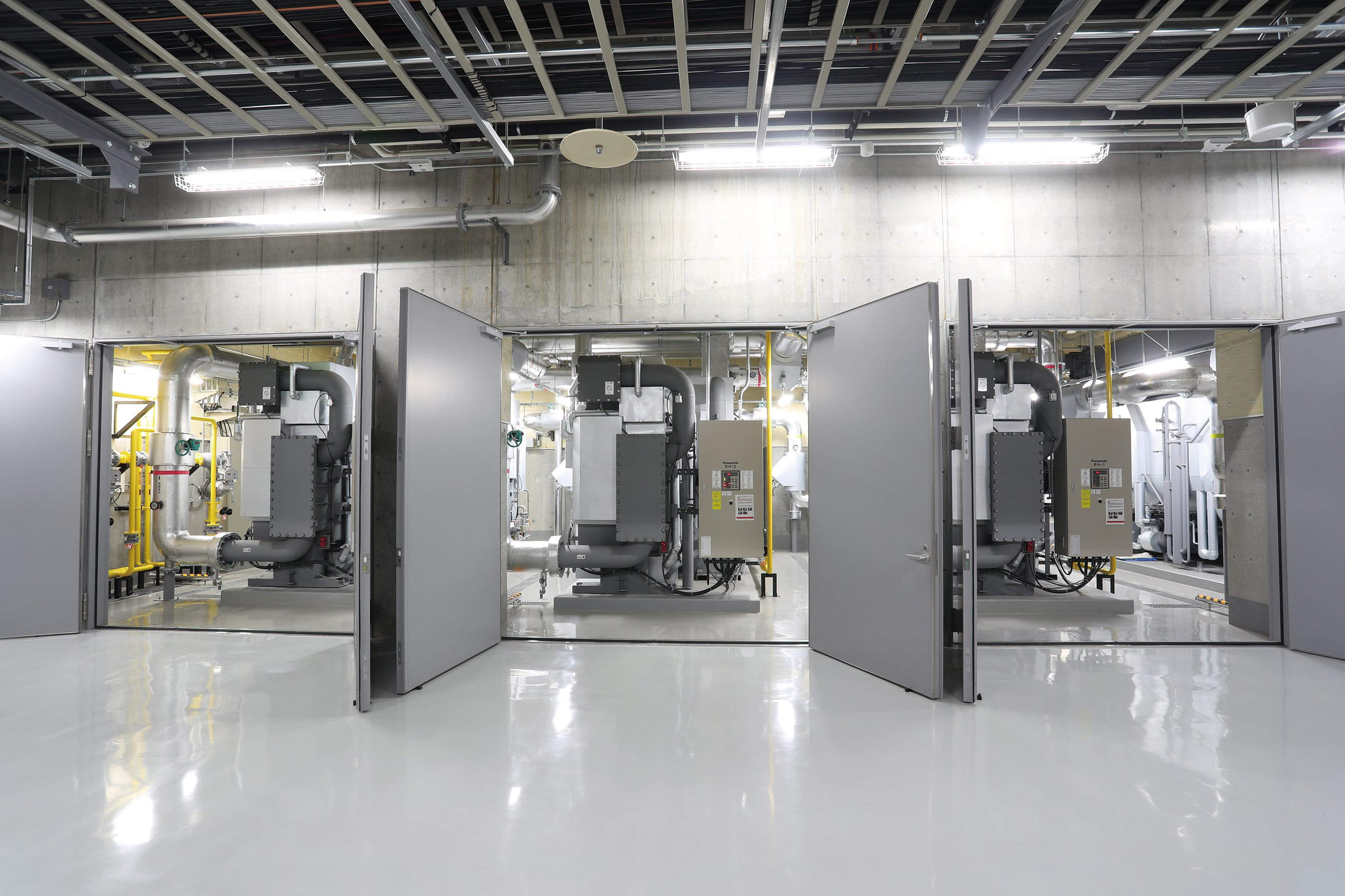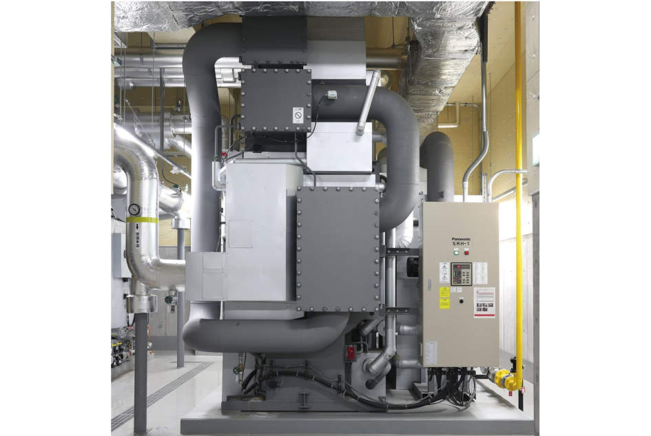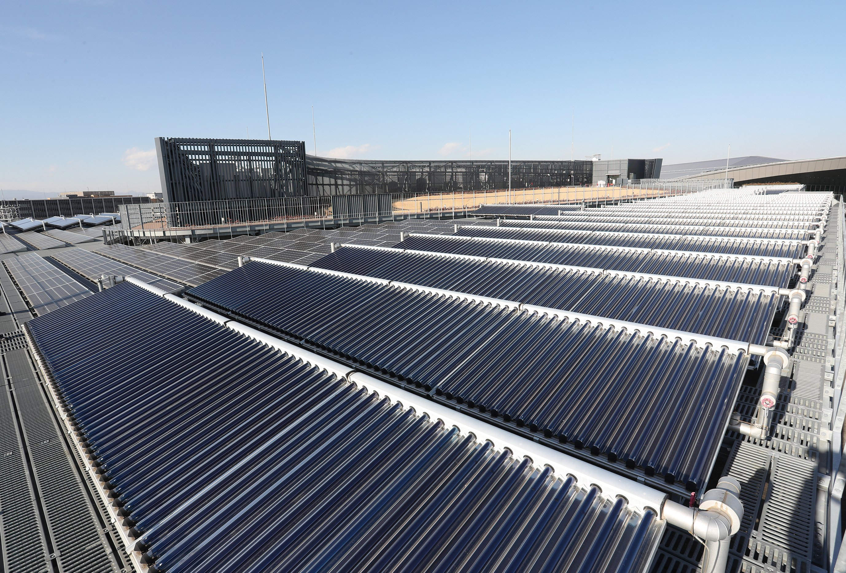 最新のエネルギー技術を積極的に取り入れた設備の一つとして、太陽熱集熱器と当社のソーラーナチュラルチラーを組み合わせた空調システム「ソーラークーリングシステム」が採用されています。太陽熱で作られた温水を空調利用し、エネルギー消費量の低減を可能にするなど、再生可能エネルギーを最大限に利用したシステムで、省エネ・省CO2に大きく貢献しています。