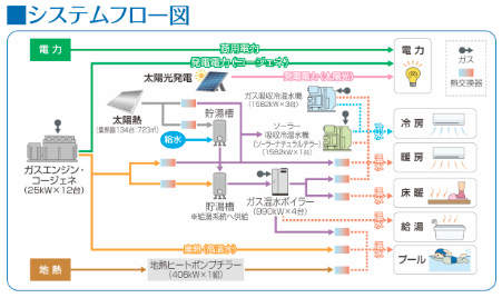 太陽熱利用だけでなく、太陽光発電、雨水利用、地中熱利用等の再生可能エネルギーの活用や、ガスコージェネレーションシステムで分散型発電にも対応しています。コージェネレーションについては、電力ピークカットに貢献するだけでなく、BCP対策として停電対応型を採用し、エネルギーセキュリティの強化も図られています。