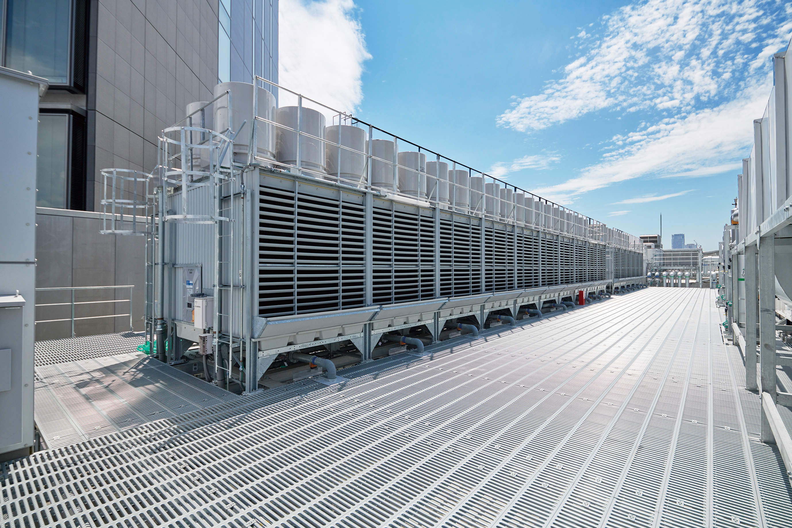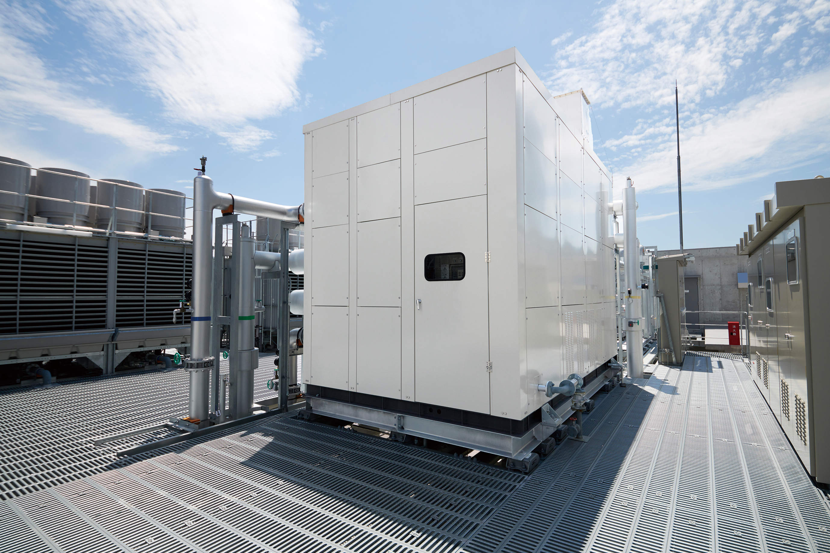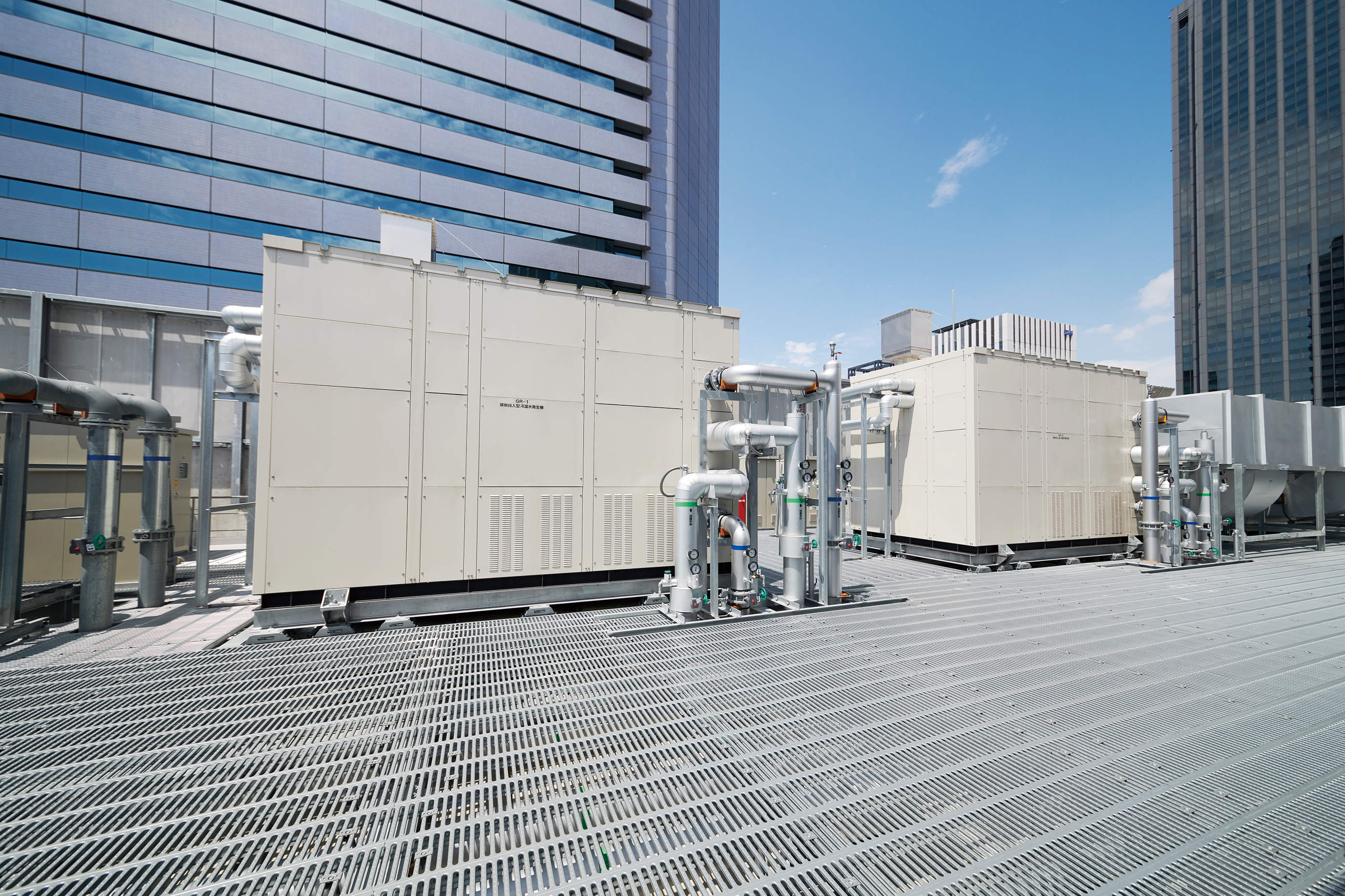 読売テレビ様の新社屋では、環境に配慮した様々な設計を導入しています。今回、スタジオや食堂で利用状況に応じて空調をコントロールするシステムや、非常用発電機2台に加え、CO2の排出量が少ないガス発電「コージェネレーションシステム」を導入し、その熱源機として当社の「節電型ナチュラルチラーPR型ジェネリンク」をご採用いただきました。