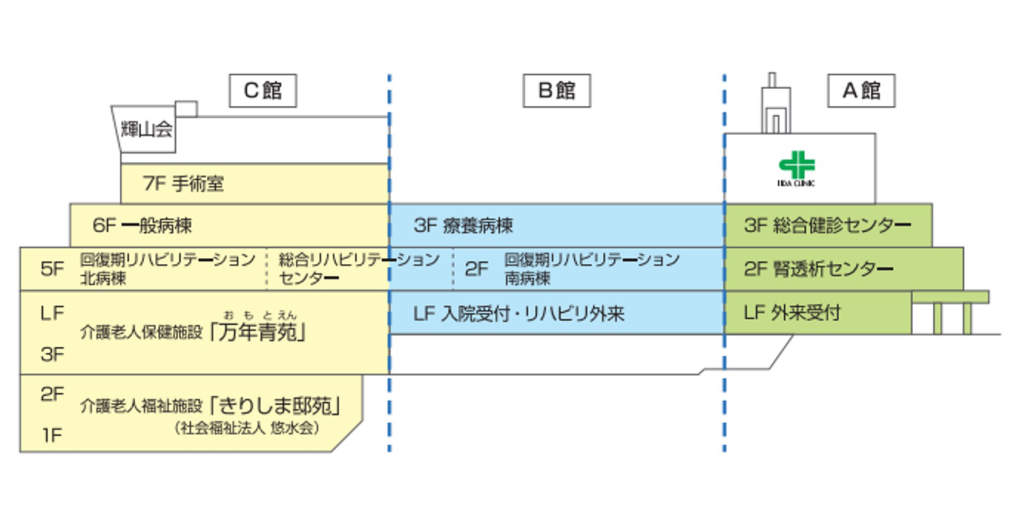 天竜の清流を脚下に臨む雄大な自然の中にある輝山会記念病院様・悠水会様は、ご利用者様を中心とした「保健・医療・福祉」の三位一体のサービスの提供を基本方針とし、おもてなしのこころを持ってご利用者様に接しています。