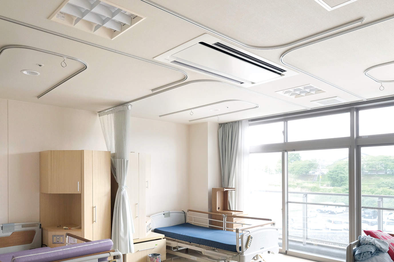 部屋の用途や場所に合わせた室内機を使用し広々とした院内をすみずみまで空調します。特にラウンジ・食堂などでは当社独自のエコナビ機能搭載の室内機を使用し、利用者様へ快適性をご提供されています。