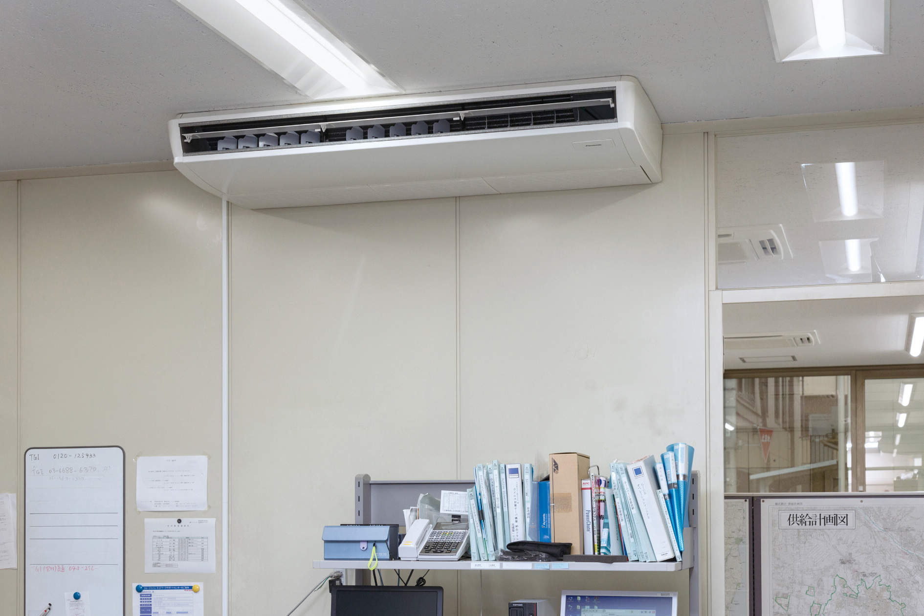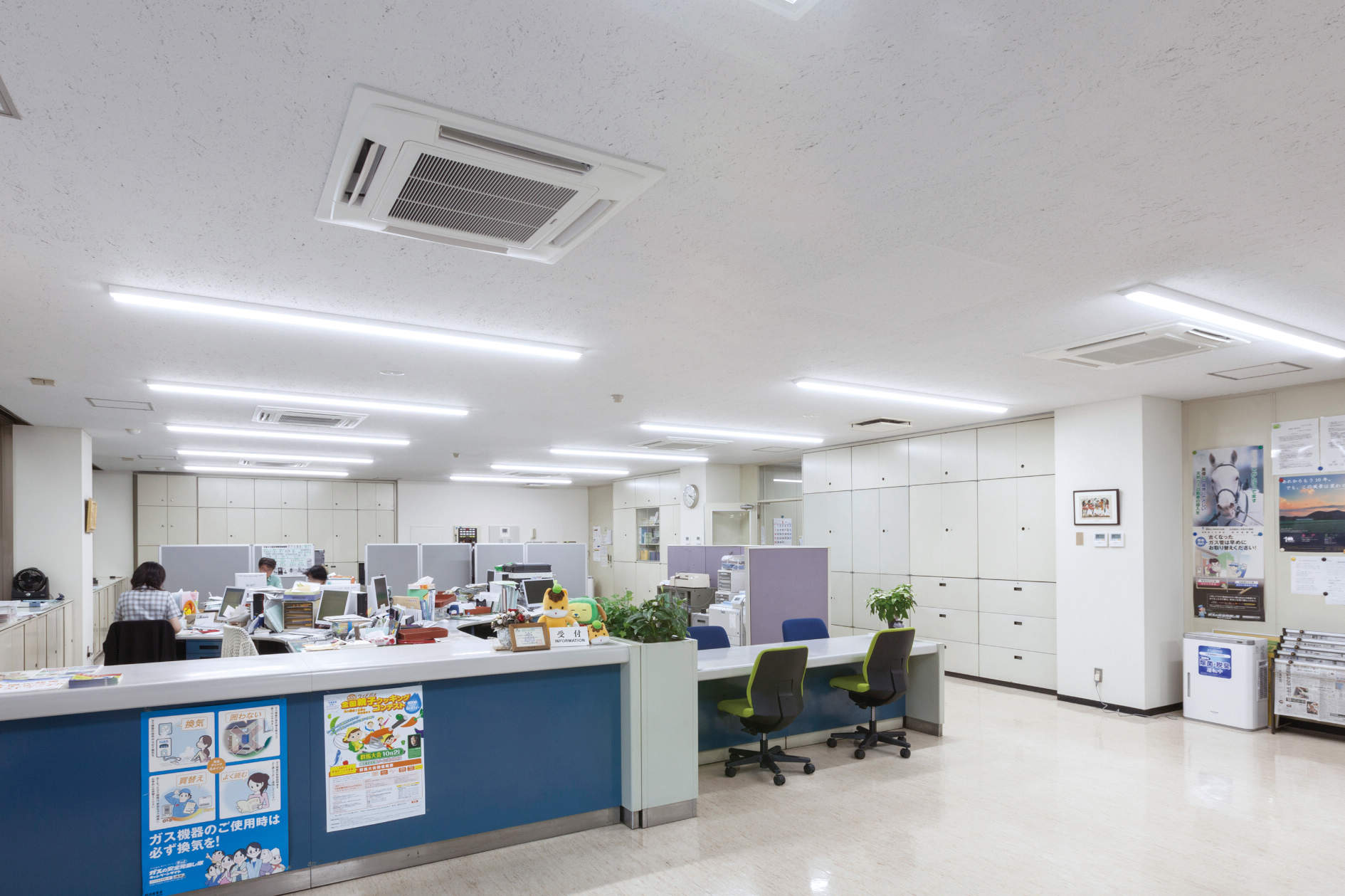 停電時には、コージェネレーションシステムでLED照明、パソコン等の電源を確保、エクセルプラスで事務所・サーバー室の空調を稼働させる設計を行いました。空調のリニューアルと同時に、LED照明もリニューアルしました。