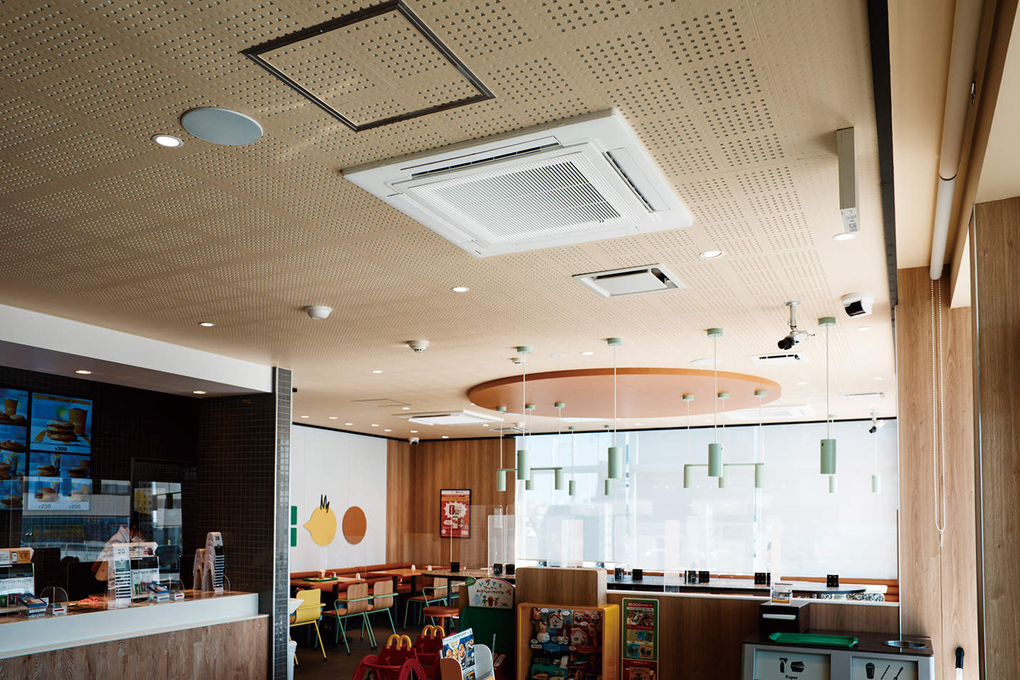 店内配置された4方向天井カセット形室内機には、ナノイーX標準搭載タイプをご採用。また室外機として、オフィス・店舗用エアコン、ビル用マルチエアコンを採用いただきました。