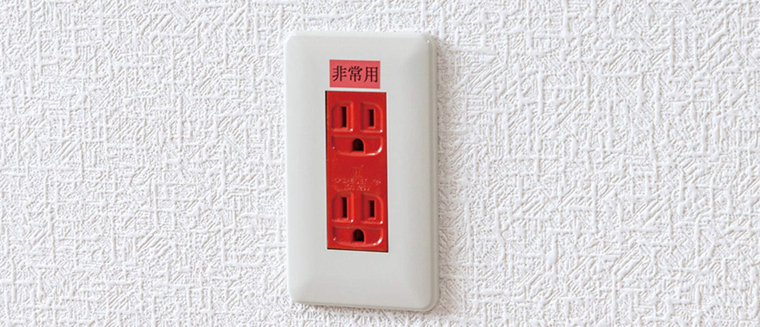 エクセルプラスは停電時に共用スペースや廊下の室内機・照明・非常用コンセントとして活用する予定です。非常用コンセントは赤いデザインを採用、非常時におけるラジオや携帯電話の充電等への活用が期待されます。