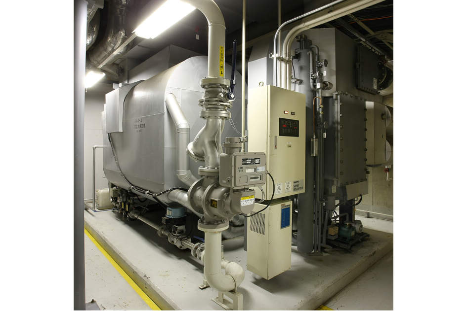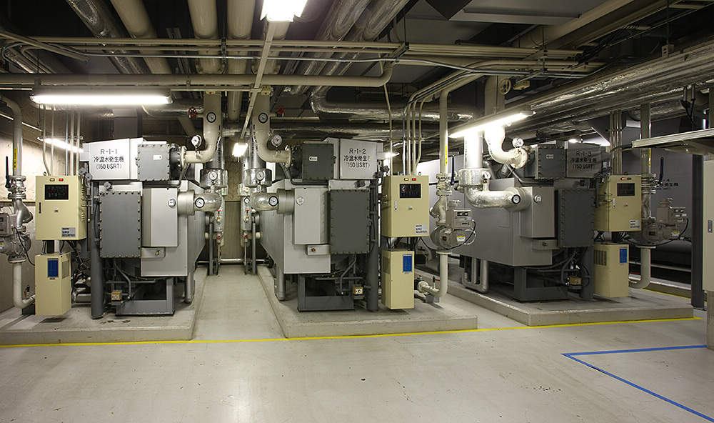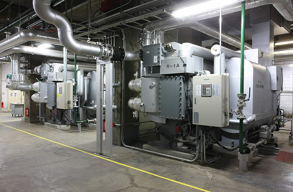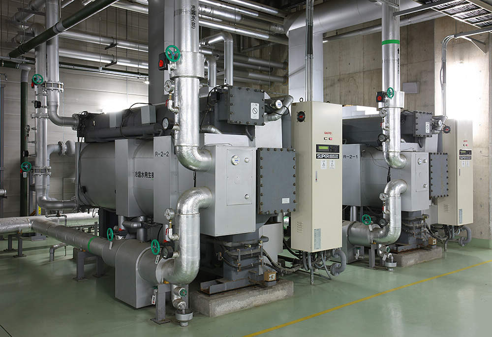 各エリアごとに設置された吸収冷温水機は、現地二次側でのコントロールを優先して運転。広大な敷地に点在する17基には熱源コントローラが設置され、全機、中央監視室で運転スケジュールや発停を管理されています。