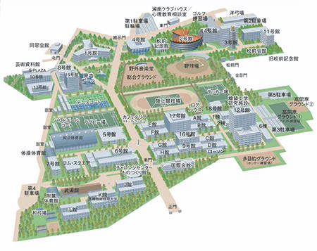 所在地住所が平塚市でありながら、敷地内の一部のエリアが隣の秦野市に位置するという広大な湘南キャンパス様は、約21,000人の学生数を誇ります。18号館までの校舎、9棟の研究実験棟、また記念館、武道館、体育館などを有する広大な学びの場です。