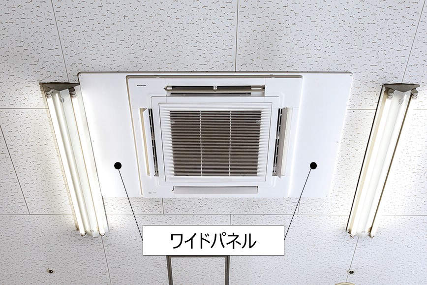 ワイドパネル(別売品)使用で他室外機からの入れ替えも可能です。天井を落ち着いた暗い色でデザインした売り場にはブラックのパネルを使用し、売り場の雰囲気を損なわない工夫をしています。