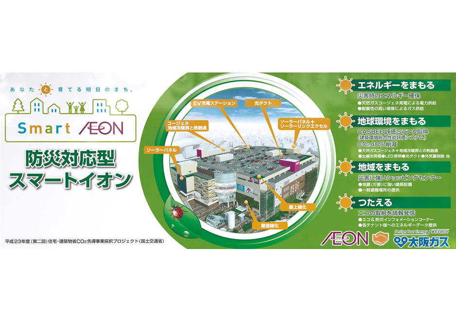 2006年には「災害時における物資供給および防災活動への協力に関する協定」を大阪府と締結。この「防災対応型スマートイオン」は、節電、省エネに対する社会的ニーズの高まりや東日本大震災の経験を踏まえ、耐震性強化や津波対策と共に、非常時の電源確保を実現して地域の防災拠点として機能することをめざしています。