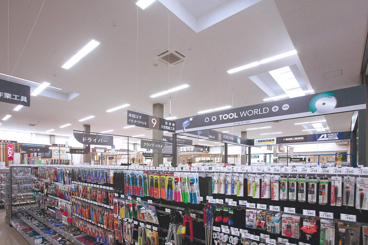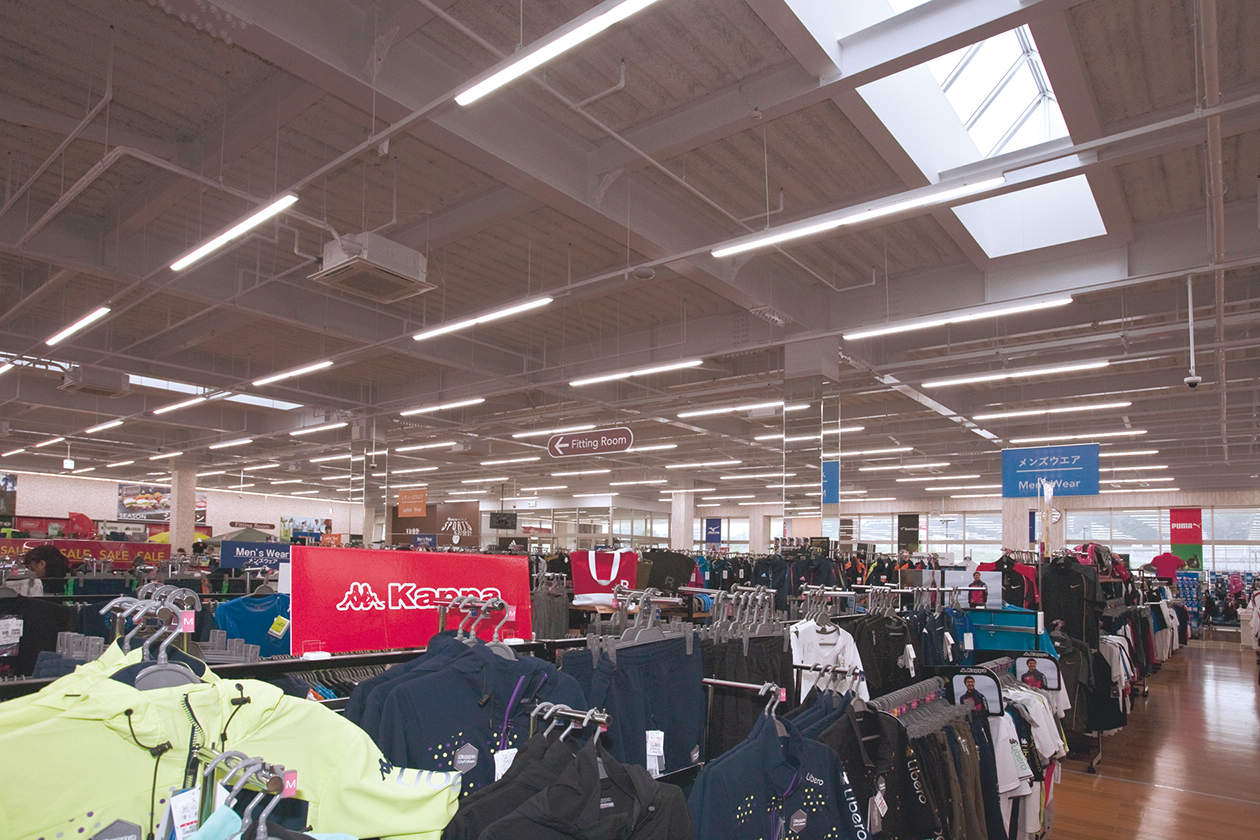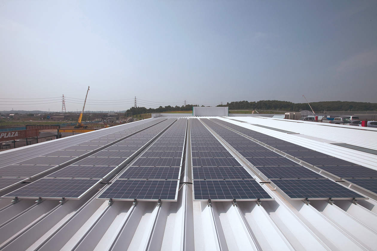 ベイシアワールドスポーツとカインズホームでは、太陽光を活用する「トップライト」を店内随所に配置して照明電力を削減。カインズホーム資材館の屋根には192枚の太陽光パネルを設置。店内のモニターで発電量を見ることができます。